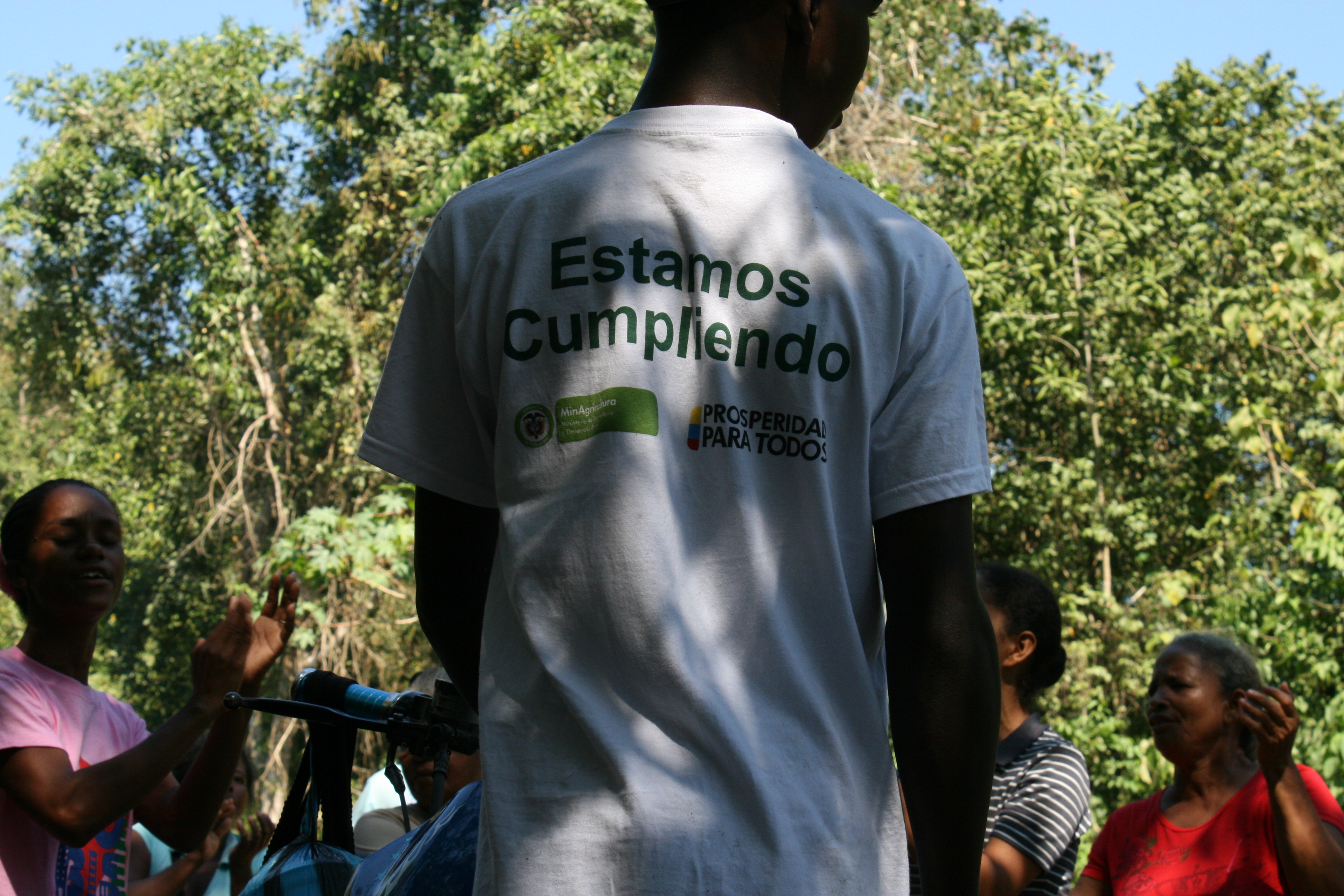 The president of Colombia, Juan Manuel Santos, finally visited Mampuján last month. I unfortunately had another meeting elsewhere, so wasn’t able to attend, but from what I have gathered, it was a spectacular flurry of government self-congratulations. T-shirts were liberally distributed, thanking the government on the front, and on the back declaring boldly “Estamos Cumpliendo” (We are Completing). I received 17 google alert emails about Mampujan that day.